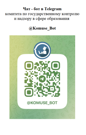 Вместе с тем сообщаем, что Министерством в мессенджере Telegram создан чат-бот @Komuse_Bot для размещения информации по вопросам лицензирования и государственной аккредитации образовательной деятельности, контрольно-надзорной деятельности, в том числе по вопросам документационной нагрузки на педагогических работников